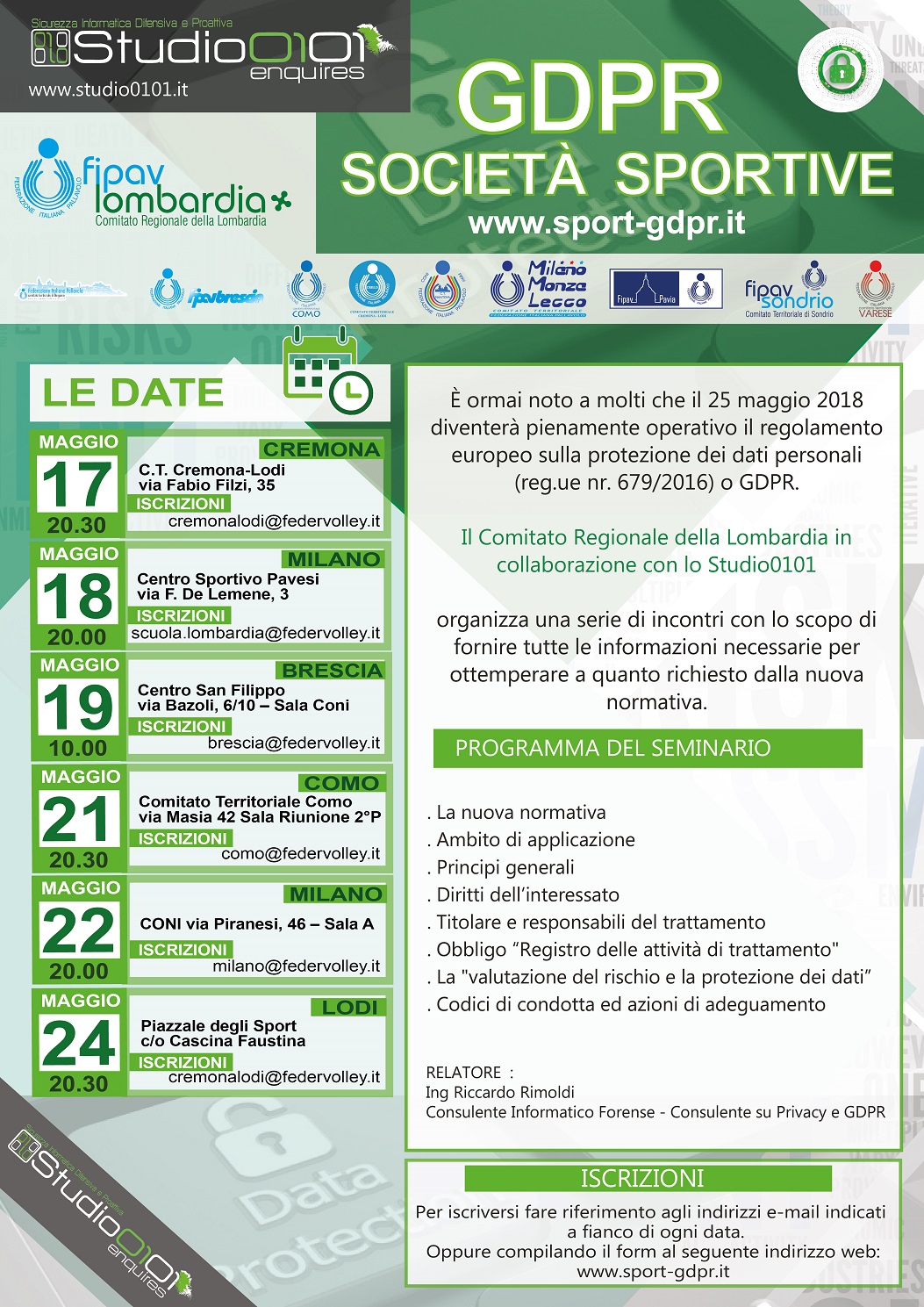 Il 25 maggio 2018 diventerà pienamente operativo il nuovo Regolamento europeo sulla protezione dei dati personali. Per questo motivo il Comitato regionale Fipav Lombardia, in collaborazione con lo Studio 0101, organizza sul territorio una serie di eventi per spiegare alle società e addetti al settore come ottemperare a quanto richiesto dalla normativa.
