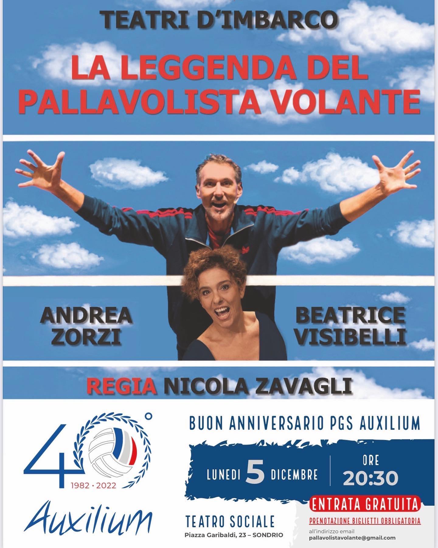 Quest’anno ricorre il 40° ANNIVERSARIO della costituzione della P.G.S. AUXILIUM Asd (1982/2022). Per festeggiare l’importante ricorrenza la società ha organizzato alle ore 20.30 del 5 dicembre 2022, presso il Teatro Sociale di Sondrio in piazza Garibaldi, una festa che vedrà protagonista il due volte campione del mondo e tre volte campione europeo, Andrea Zorzi con il suo spettacolo teatrale “La leggenda del pallavolista volante” interpretato insieme all’attrice Beatrice Visibelli.