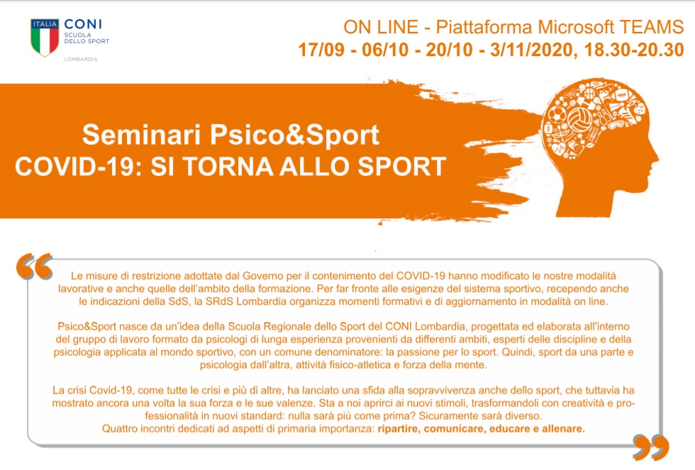 Si pubblica la comunicazione della Scuola Regionale dello Sport Lombardia relativa al Seminario Psico&Sport che si svolgerà on line a partire dal 17 settembre.
