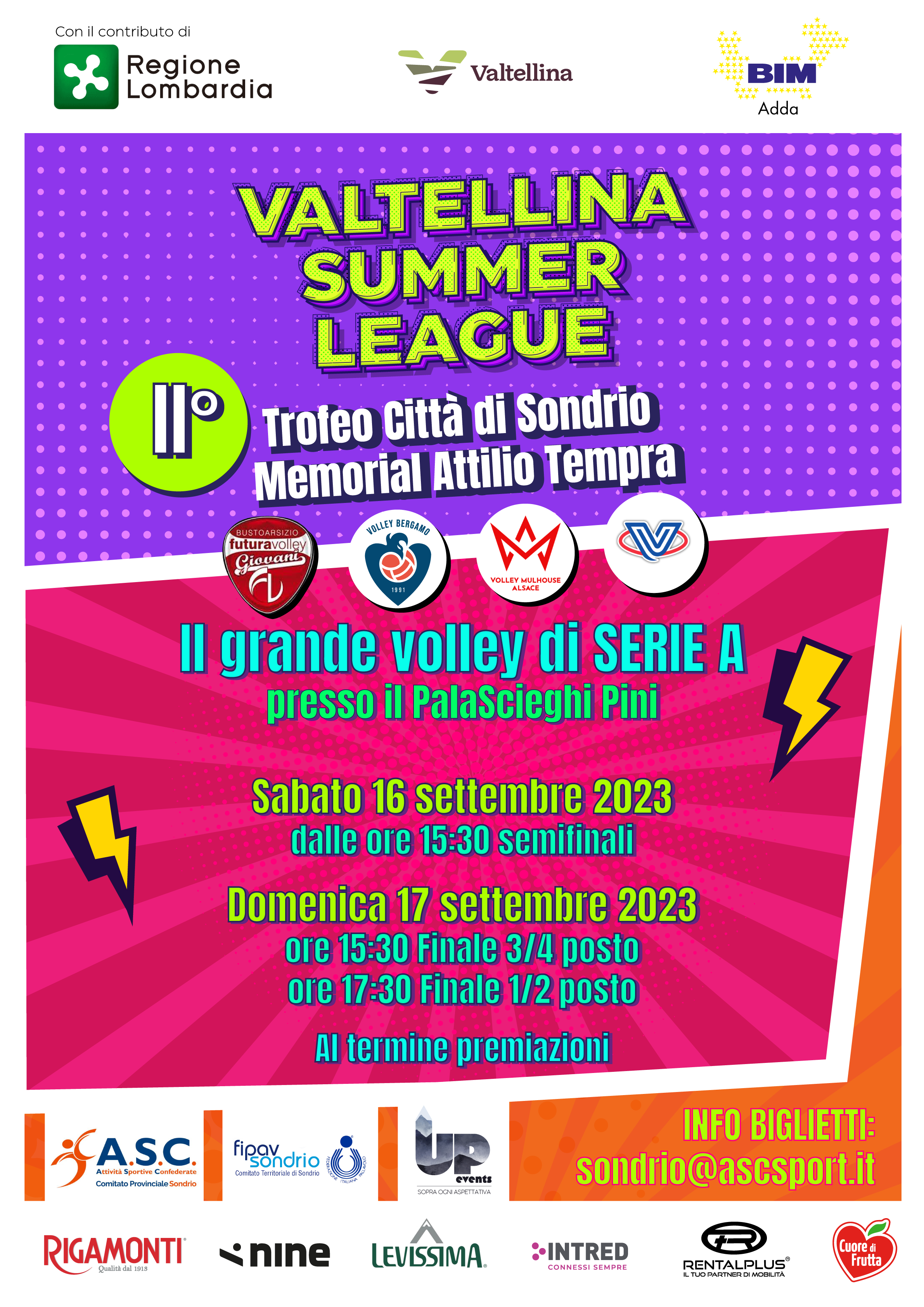 Valtellina Summer League a Sondrio nel week end Posted by Maura Savaris / Campionati / 0 Comments Il grande volley a Sondrio, per una due giorni di gare da non perdere. Sede delle gare, il PalaScieghi Pini, con Futura Volley, Volley Bergamo, Volley Mulhouse e Vero Volley. Nella locandina in allegato, trovate tutti i dettagli. Riassunto allegati valtellina summer league (2 MB)
